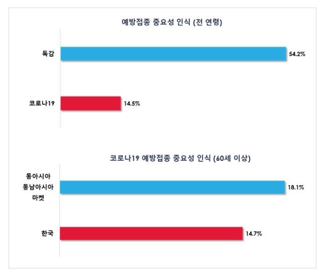 예방접종의 중요성에 관한 조사에서 국내 응답자의 54.2%는 감염 예방과 건강 보호를 위해 '연례 독감 백신 접종'이 중요하다고 답했으나 '연례 코로나19 백신 접종'의 중요성에 대해 긍정적으로 답한 비율은 14.5%에 불과해 두 질환 간 인식 차이가 약 3배에 달했다. 또한 60세 이상에서 단 14.7%만 코로나19 백신 접종의 중요성을 인식하고 있어 동아시아·동남아시아 마켓 평균(18.1%)을 하회하는 수준으로 나타났다. 한편 업데이트된 코로나19 백신의 접종 의향에 대해 국내 60세 이상 응답자의 57.8%가 접종하겠다고 응답하며 높은 수치를 기록했다.