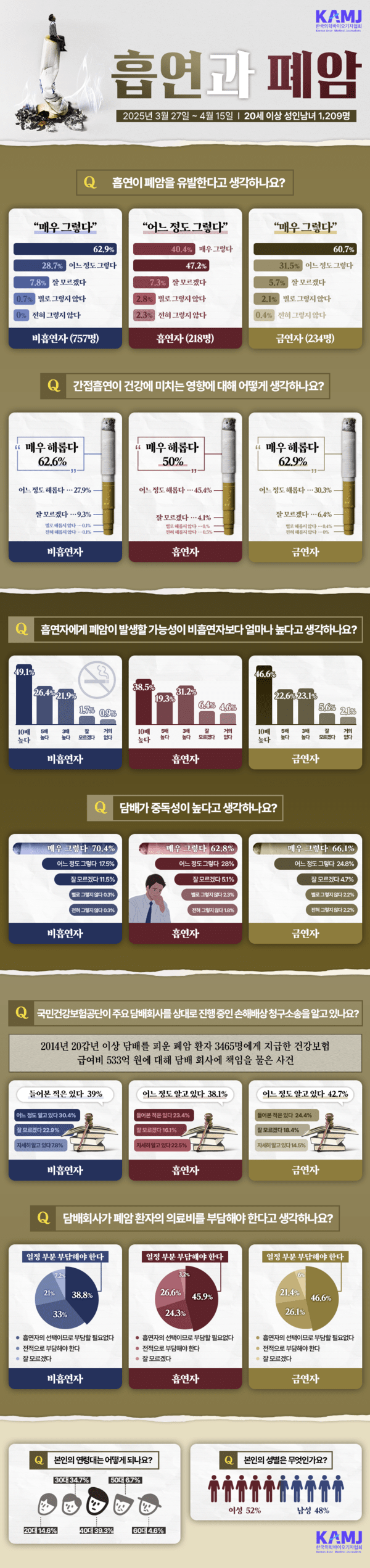 온라인 방식으로 진행한 이번 설문조사는 지난 3월 27일부터 4월 15일까지 전국 20세 이상 성인 1209명(비흡연자 757명, 흡연자 218명, 금연자 234명)을 대상으로 이뤄졌다.