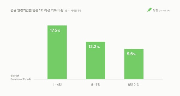 분석 결과에 따르면 월경 기간이 짧을수록 탐폰 사용 비중이 높은 것으로 확인됐다. 평균 월경 기간이 1~4일인 여성 사이에서 탐폰을 한 번이라도 기록한 비중은 17.5%로 5~7일(12.2%), 8일 이상(9.6%)보다 높았다.