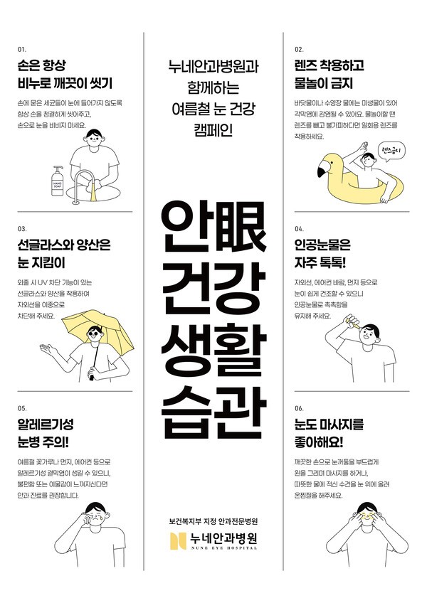 누네안과병원은 여름철 자외선으로 인한 눈 건강 악화를 예방하고 올바른 관리 습관을 알리기 위한 캠페인을 진행한다. 일상생활에서 실천할 수 있는 자외선 차단 방법을 안내하고 실천을 독려한다. 누네안과병원 송원석 원장은 “여름철 눈 건강을 지키기 위해선 자외선 노출을 최소화하는 것이 가장 기본적인 예방법”이라며 “강한 자외선에 장시간 노출될수록 망막 손상 등 각종 안 질환 발생 위험이 커지므로 햇볕이 강한 날엔 모자나 선글라스를 착용해 눈을 보호하는 습관을 길러야 한다”고 강조했다.